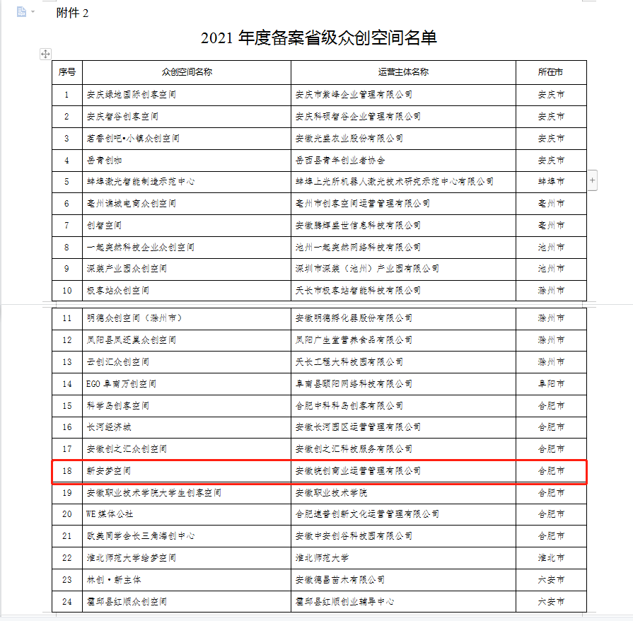 根據《安徽省科技企業孵化器認定、眾創空間備案及績效評價管理辦法(試行)》(皖科區)〔2020〕21號)和《關于開展2021年度安徽省科技企業孵化器認定、 眾創空間備案暨復審工作的通知》(皖科區秘﹝2021﹞284號)相關標準及要求,經各市科技部門信用核查、評審、實地核查、公示,并發布《關于公布安徽省2021年度認定(備案)省級科技企業孵化器和眾創空間名單的通知》,新安夢空間等31家眾創空間被認定為“省級眾創空間”